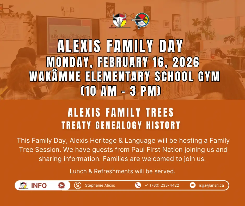 This Family Day, Alexis Heritage & Language will be hosting a Family Tree Session. We have guests from Paul First Nation joining us and sharing information. Families are welcomed to join us.